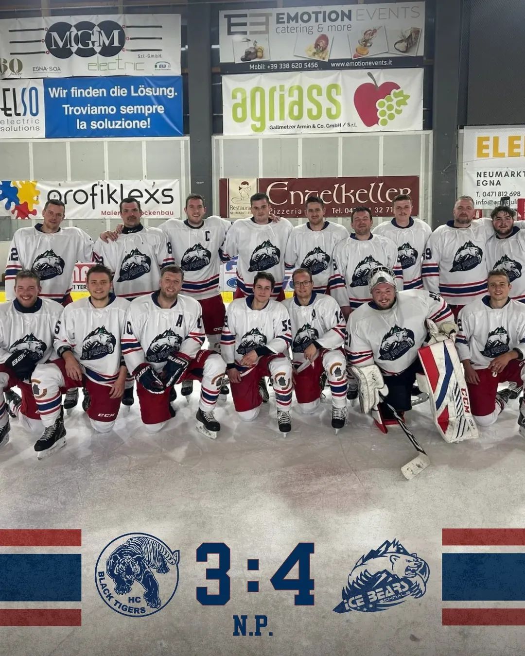 Am Freitag, 15.Dezember, gastierten die Titelfavoriten bei uns im Waldstadion Texel. Gleich zu Beginn der Partie war klar, dass unsere Jungs, die nur schwach besetzt waren, es schwer kriegen werden gegen den HC Black Tigers. In diesem Kader sind einige Ex Serie A und B Spieler aufzufinden.Die Gäste bauten von Anfang an enormen Druck auf und wir taten uns schwer aus der defensiven Zone herauszukommen. Nach dem ersten Tor der Gäste knickten wir ein und wir ließen zu viele Möglichkeiten zu. Somit ging’s mit einem 0:4 Rückstand zum ersten Pausentee. Im 2. Drittel kamen wir besser ins Spiel und erspielten uns die ein oder andere Chance heraus. Auch in der Defensive konnte man besser Dagegenhalten. Im Schlussabschnitt konnten wir durch viel Willenskraft und guten Zusammenspiel den Ehrentreffer erzielen. Fabian Tappeiner netze in Unterzahl auf Zuspiel von Hannes Gurschler zum 1:5 ein. Schließlich trennten sich die Mannschaften mit einem Endstand von 1:6 für die Gäste. Im Großen und Ganzen können wir mit unserer Leistung trotz Allem zufrieden sein. Bester Spieler bei den IceBears war wieder einmal unser starker Goalie Zambiasi Alexander der den Gegner mit Glanzparaden zum Haare raufen brachte.